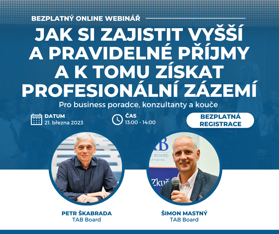 Pak právě webinář organizovaný franšízovým konceptem The Alternative Board (TAB) by neměl ujít vaší pozornosti. Majitelé master-franšízové licence tohoto původem amerického konceptu Šimon Mastný a Petr Škabrada vás seznámí s možnostmi, díky nimž můžete zužitkovat své dosavadní pracovní zkušenosti a zajistit si vyšší a pravidelné příjmy – to vše se silným a zkušeným partnerem v zádech.